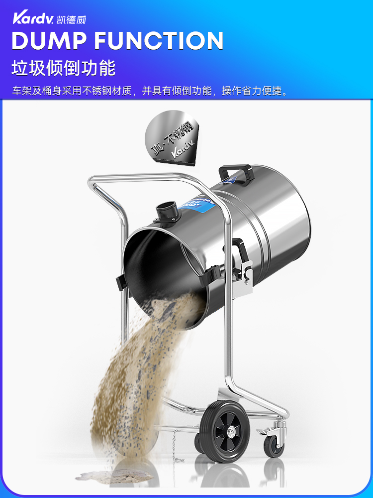 6、集塵桶及車(chē)架采用不銹鋼材質(zhì)制成,帶有傾倒功能,使用者清理桶內(nèi)垃圾時(shí)只需要提起集塵桶的傾倒提手就可輕松清理;集塵桶為45L。