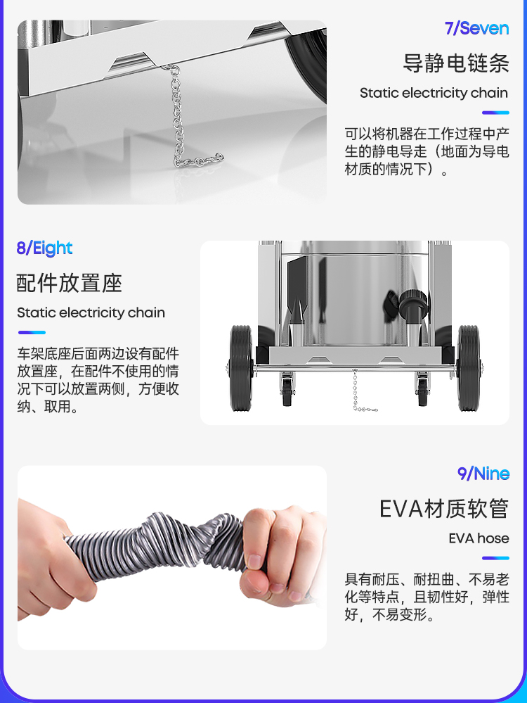 三顆雙層電機(jī)可根據(jù)需要分開單獨(dú)工作,也可聯(lián)合一起工作,還帶有同步系統(tǒng),集塵桶為不銹金剛材質(zhì)耐撞擊,車架底座采用豪車車頭設(shè)計(jì),前輪為可30度旋轉(zhuǎn)的萬(wàn)向輪;可傾倒設(shè)計(jì)使清理更這容易;五層過濾系統(tǒng),排出的空氣非常干凈,創(chuàng)新的FPPR3200濾芯是以多元酯材質(zhì)制作而成,過濾總面積為6300平方厘米,對(duì)粉末、油類、堿性物有很好的過濾效果,集塵率真為99.993%,符合BIA“C”可過濾粒子直徑為0.28UM的微粒,帶有晃動(dòng)振塵功能,解決塵隔阻塞要把馬達(dá)頭取下的難題,大大提高了工作效率;可吸塵、吸水、吸油,可20多個(gè)小時(shí)的連續(xù)工作時(shí)間。