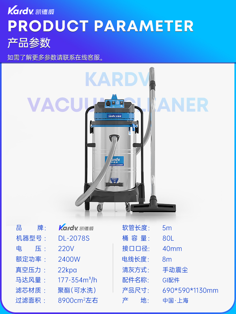 DL-2078S是一款工業吸塵器,有2顆馬達,可單獨或聯合開啟;集塵桶為80L,為不銹鋼材質,配有車架,在移動時輕巧方便,車架底座為PP材質,底座上有置物格,可放置配件或工具方便收納和使用;本機適用于五金、食品、電機、機械、化工、服裝等工商業領域的場所吸塵或吸水,每小時可清理1300平方米的地面。