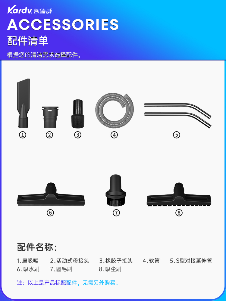 7、配有多種除塵配件,可清理多種環境下的灰塵或垃圾。車架上配有防靜電鏈,在確保地面為導電體的前提下可以將靜電導走。關鍵部件電機保修2年。
