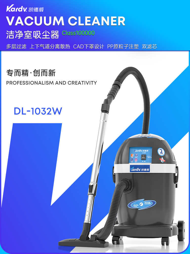 凱德威DL-1032W是一款超型無塵室專用的產品,聲音只有49db,六層過濾系統,1200W大功率,吸力極強,適用于無塵等級在1000級-10萬的實驗室,無塵車間,凈化車間等場所。